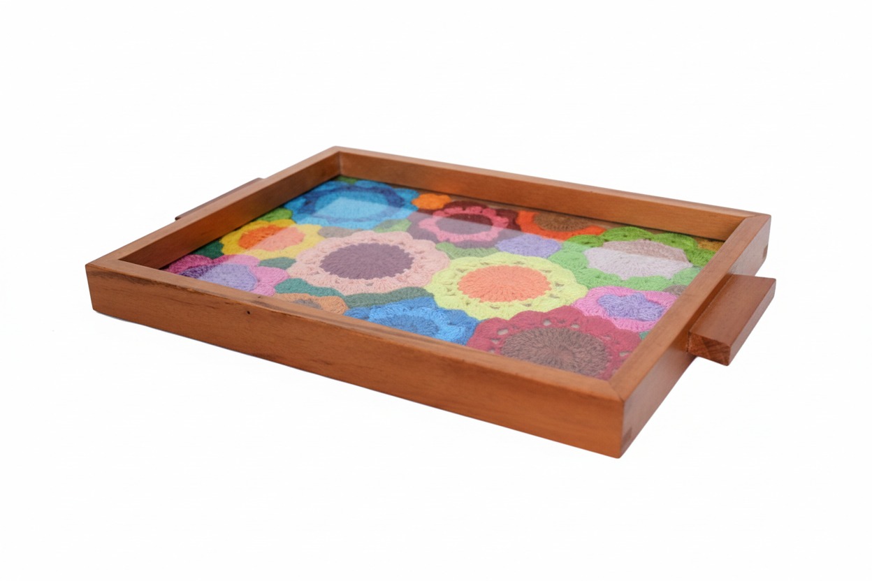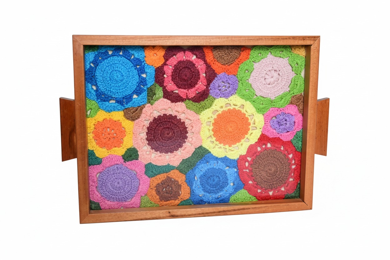 BANDEJA EM MADEIRA COLORIDO, COM ALÇA. TAMANHO G.