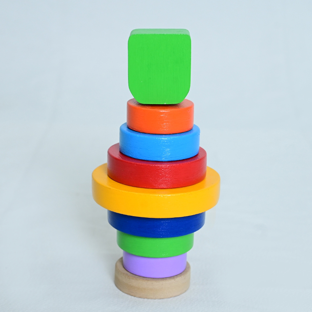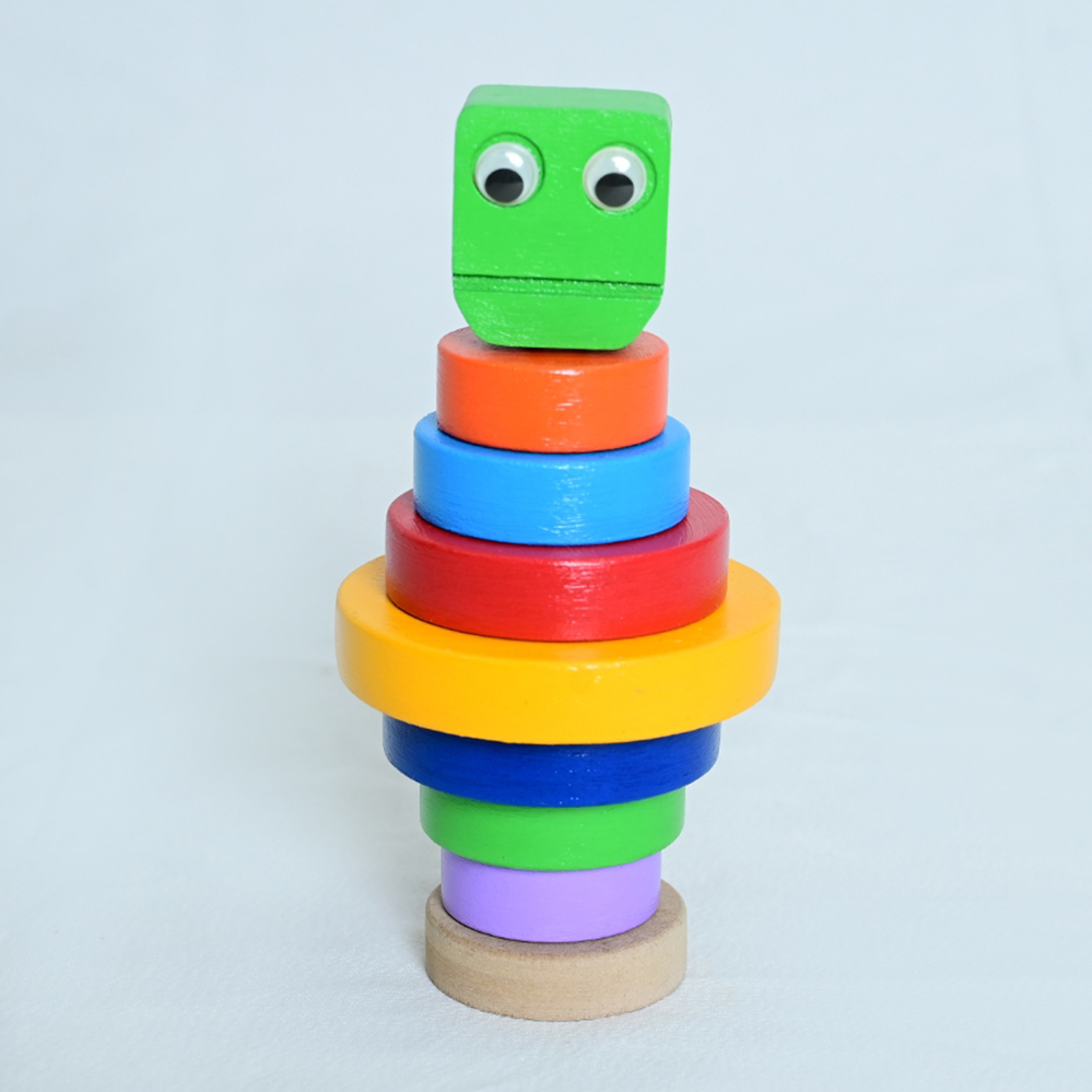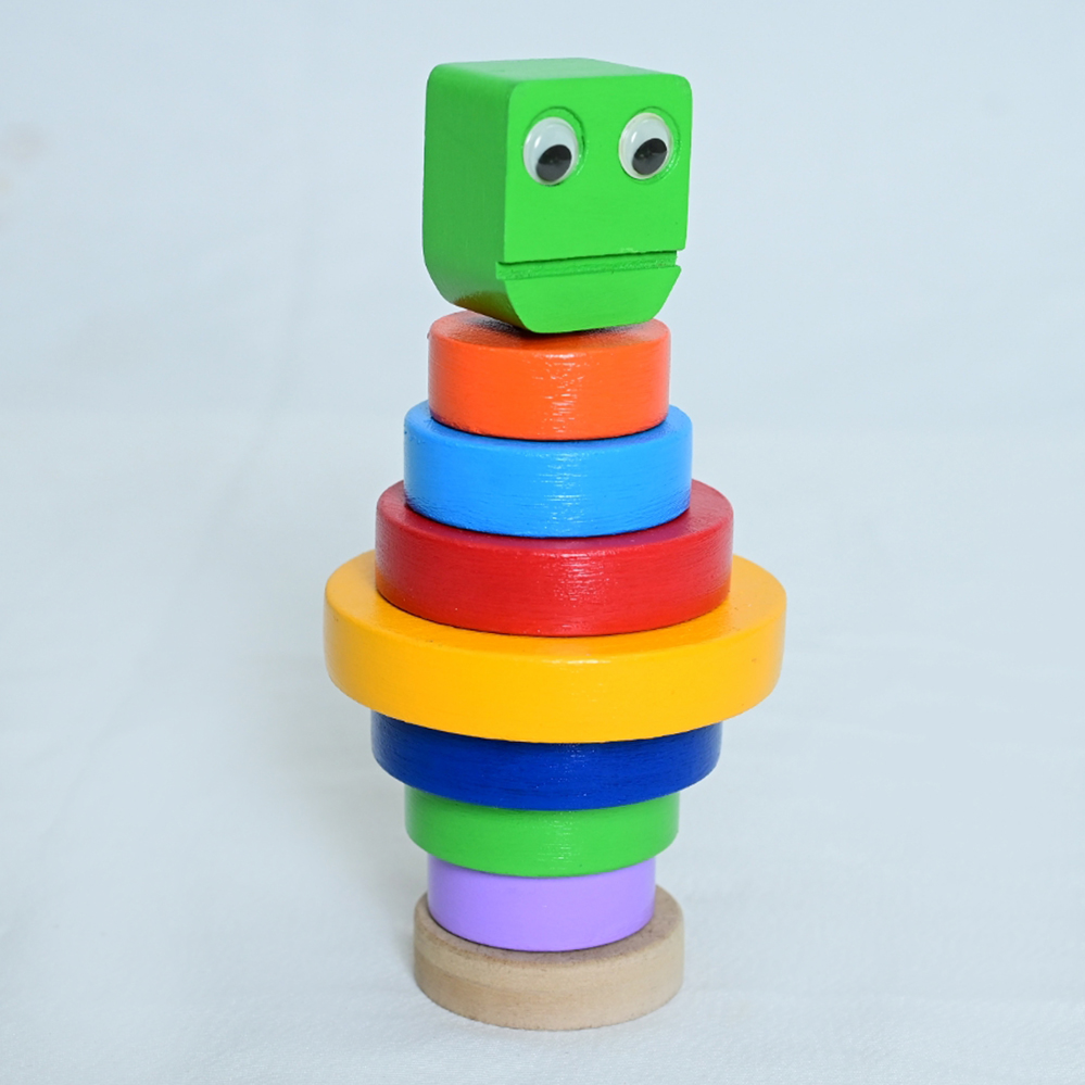 Brinquedo educativo de empilhar, composto por uma base de madeira e anéis coloridos de tamanhos variados, encimado por um bloco cúbico verde com olhos de encaixe.