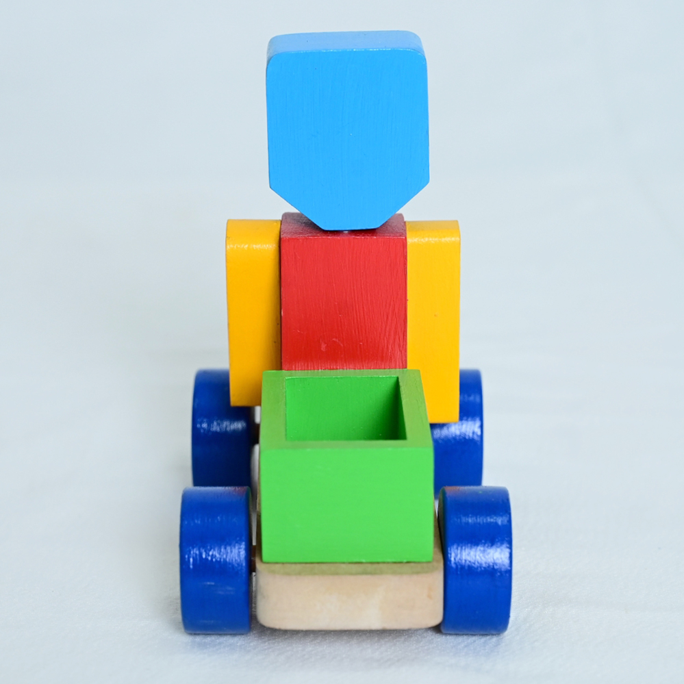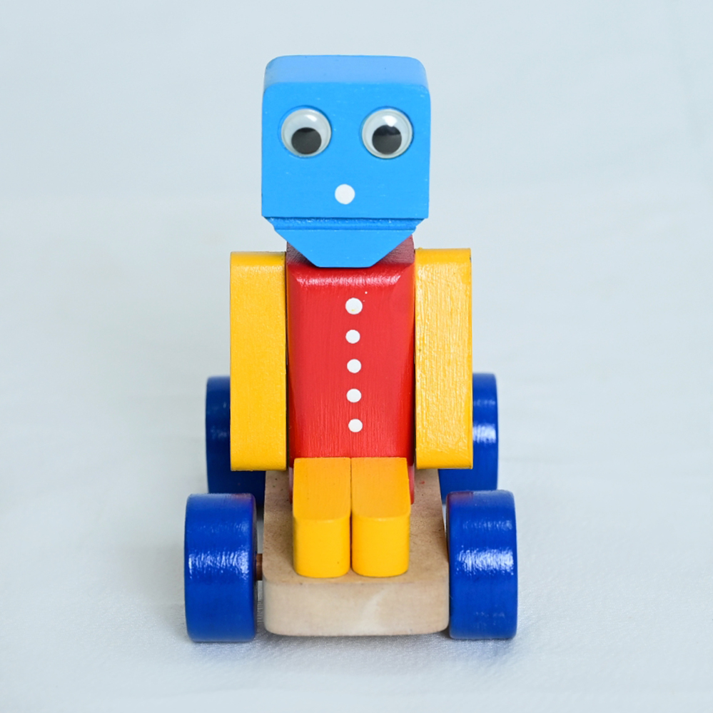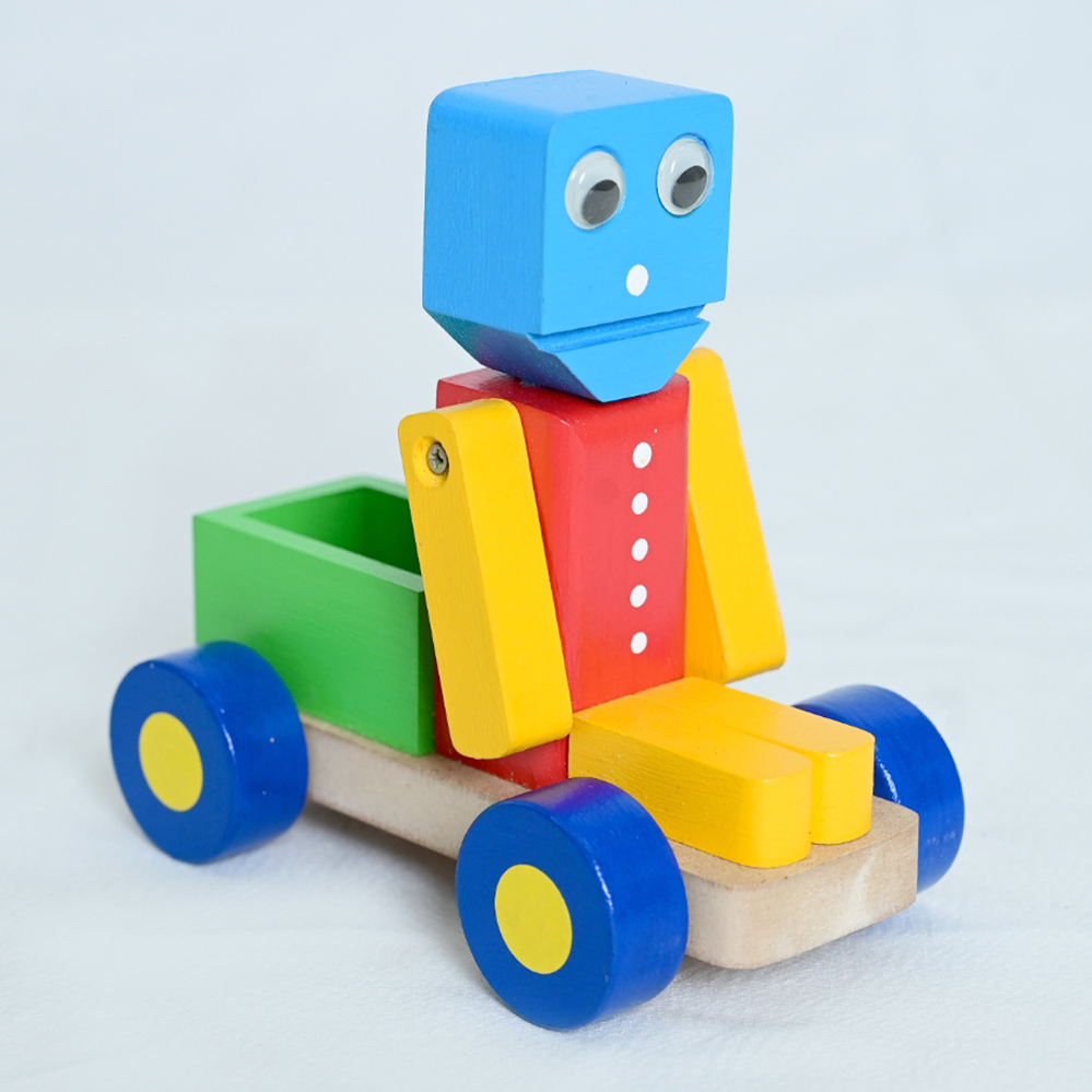 Brinquedo artesanal em madeira, colorido e com design lúdico de robô sobre rodas, combinando formas geométricas, pintura vibrante e acabamento cuidadoso, ideal para decoração ou uso educativo.