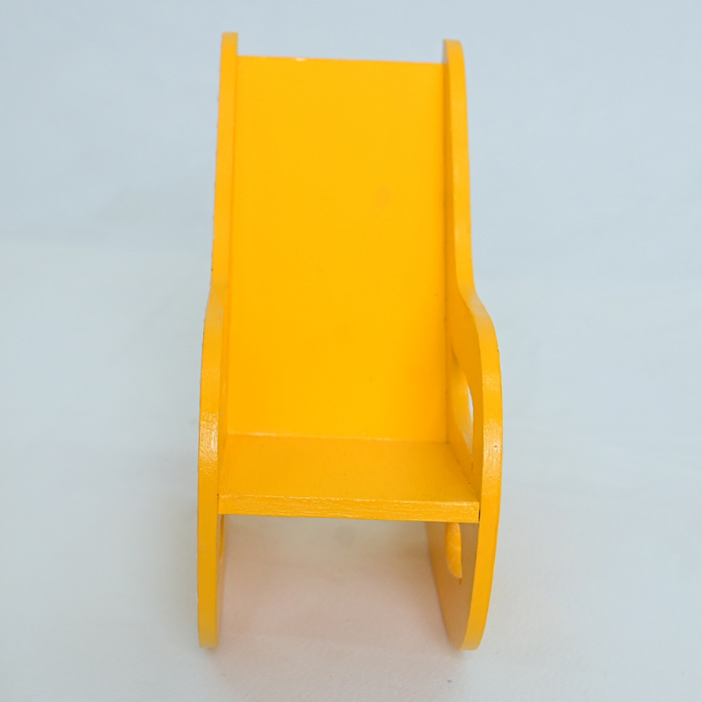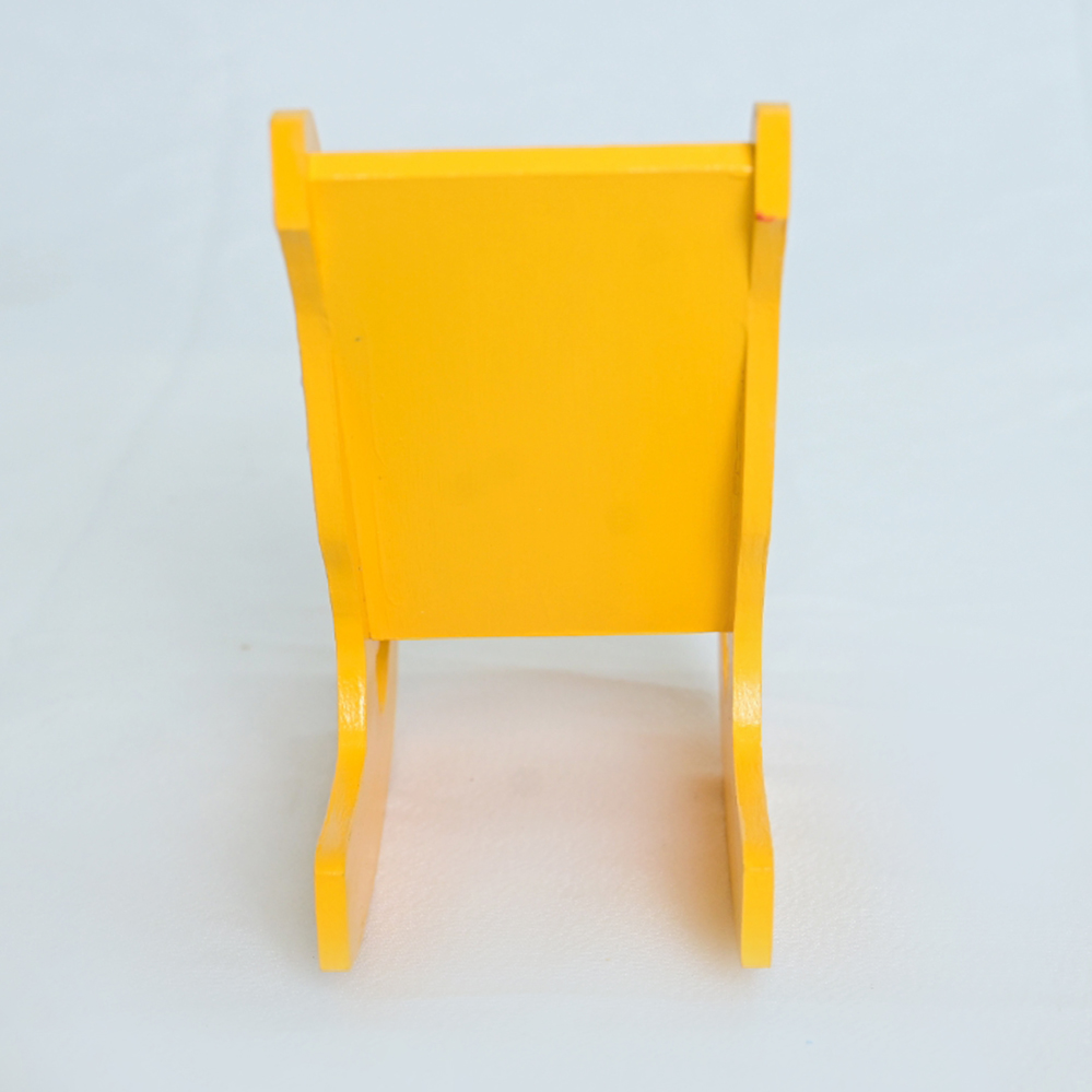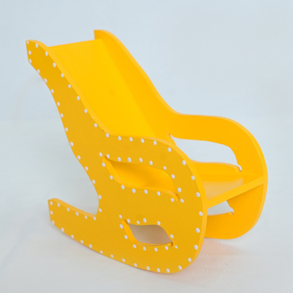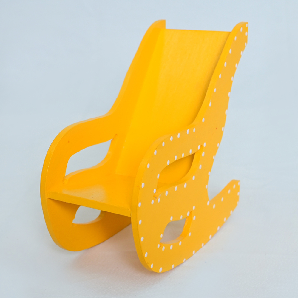 Cadeirinha de balanço artesanal em madeira, com acabamento amarelo e detalhes em poá. Peça decorativa e funcional para uso infantil ou composição de ambientes temáticos.