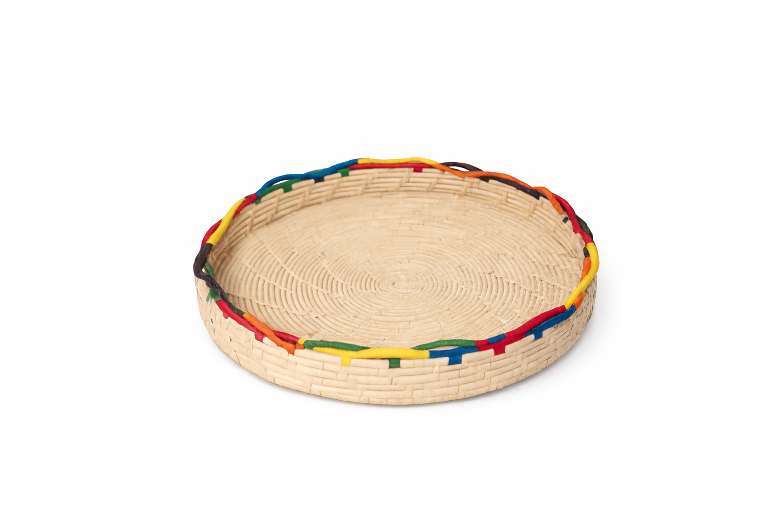 CESTA EM PALHA DE CARNAÚBA. COM BORDA ONDULADA COLORIDA.