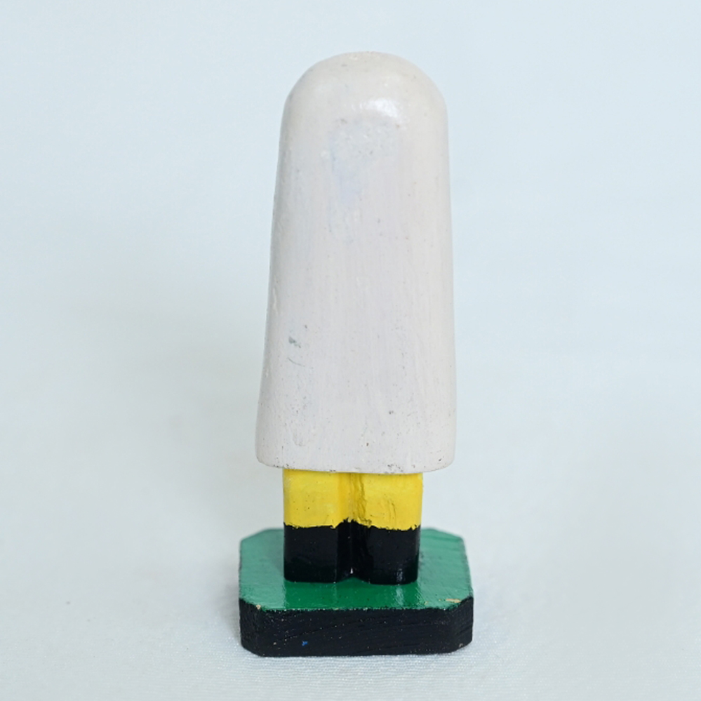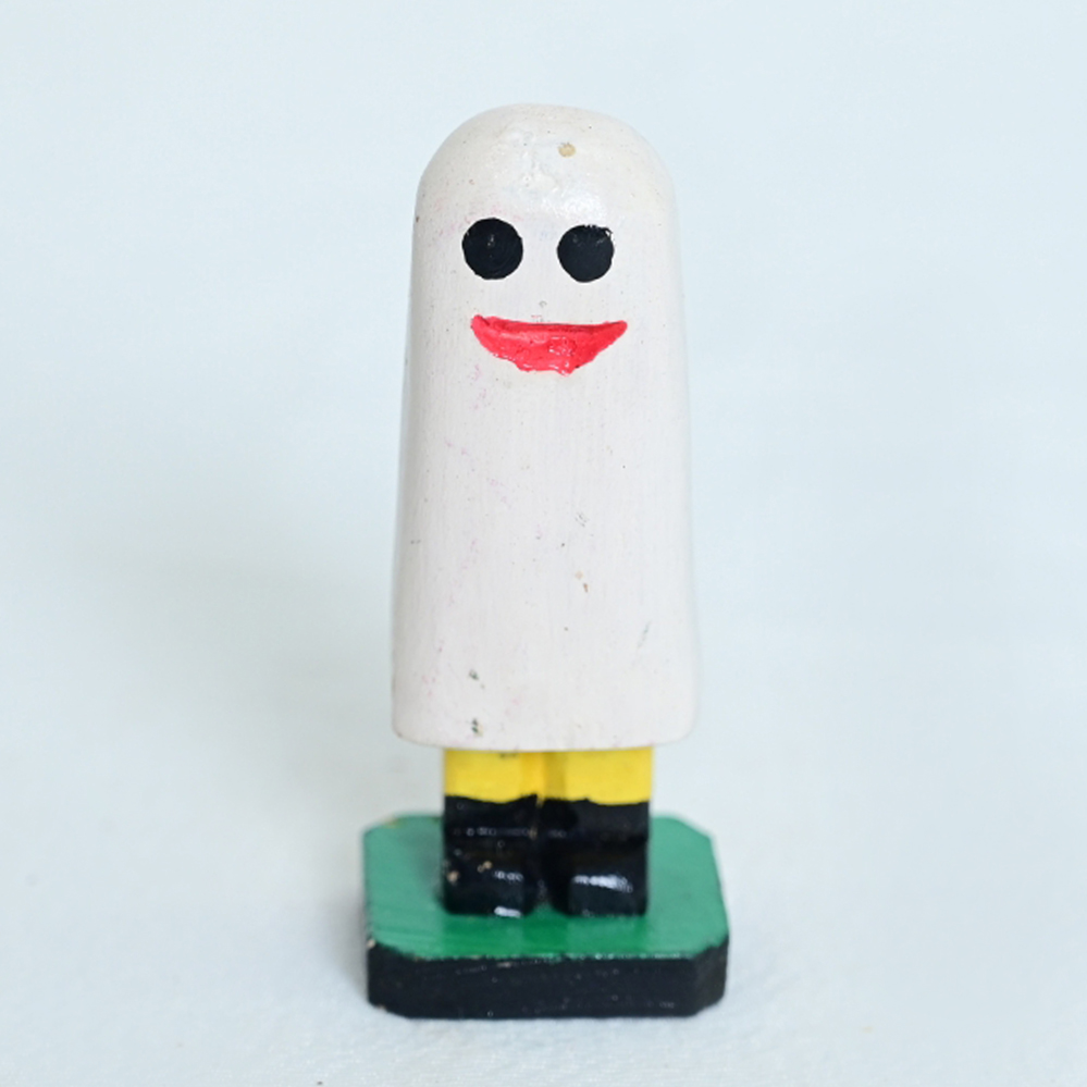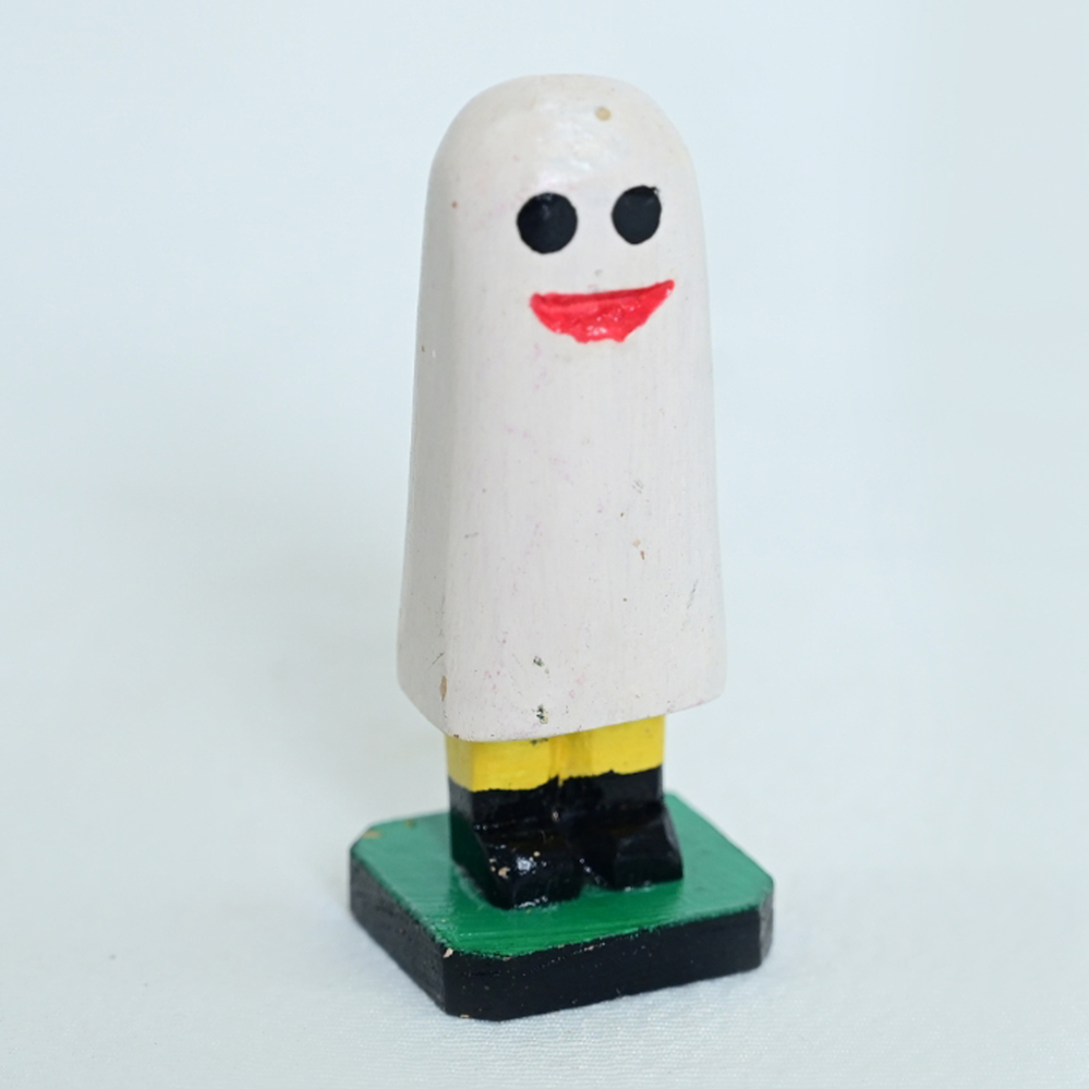 Peça artesanal em madeira , representando um fantasma com rosto simpático. Base colorida e acabamento manual, ideal para decoração criativa e colecionadores de arte popular.