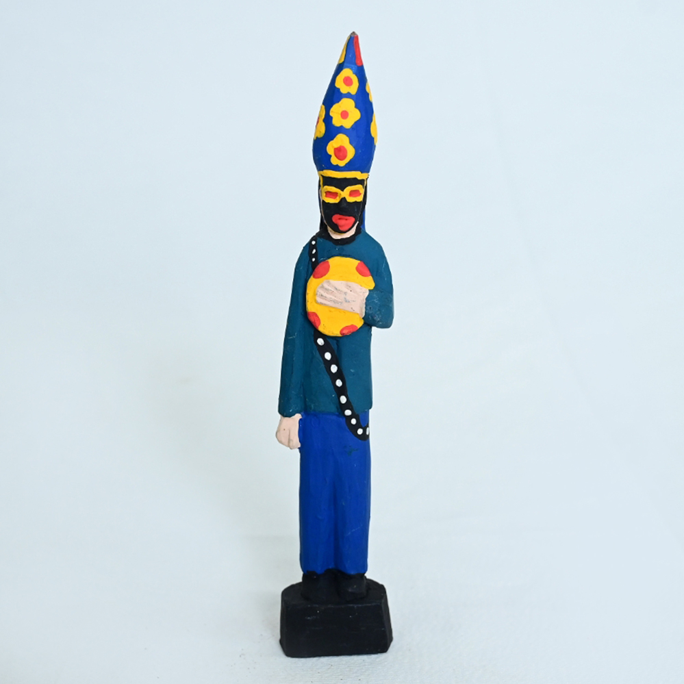 Retrata um homem mascarado, vestindo um traje azul, com um chapéu florido e segurando um pandeiro.