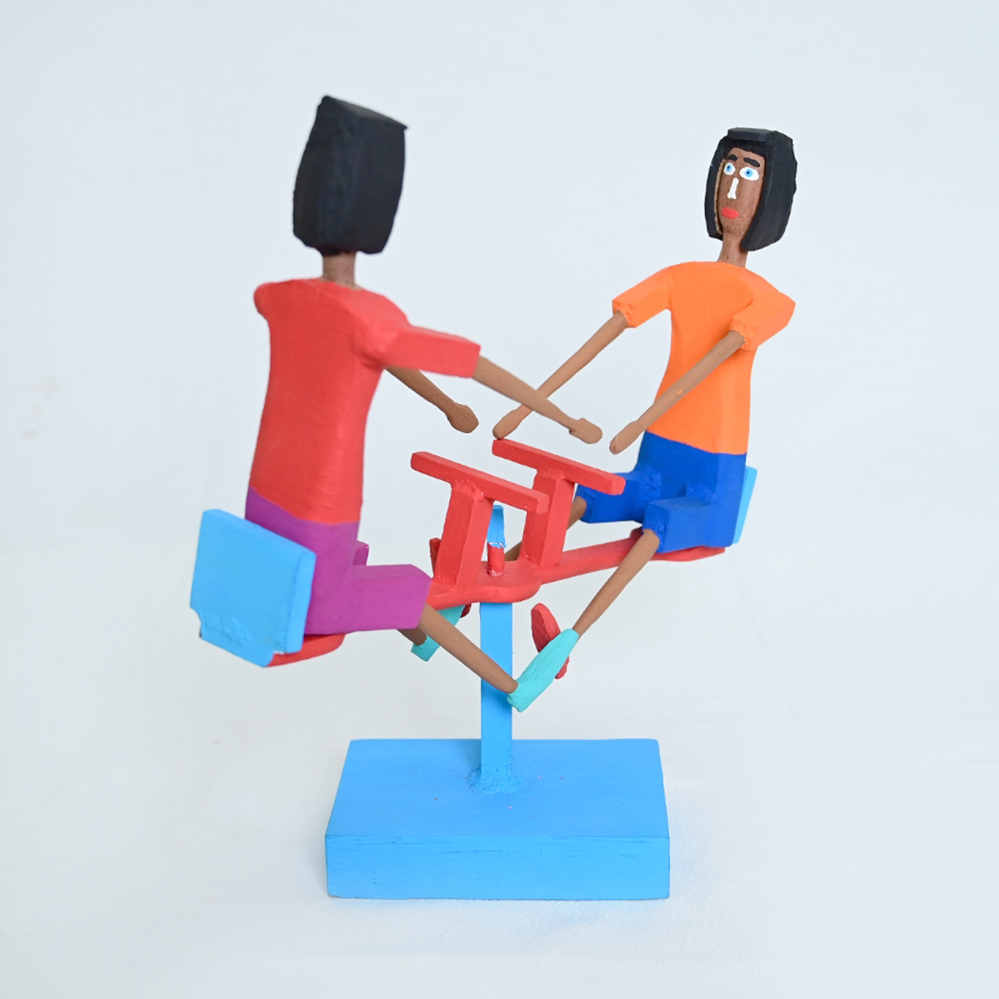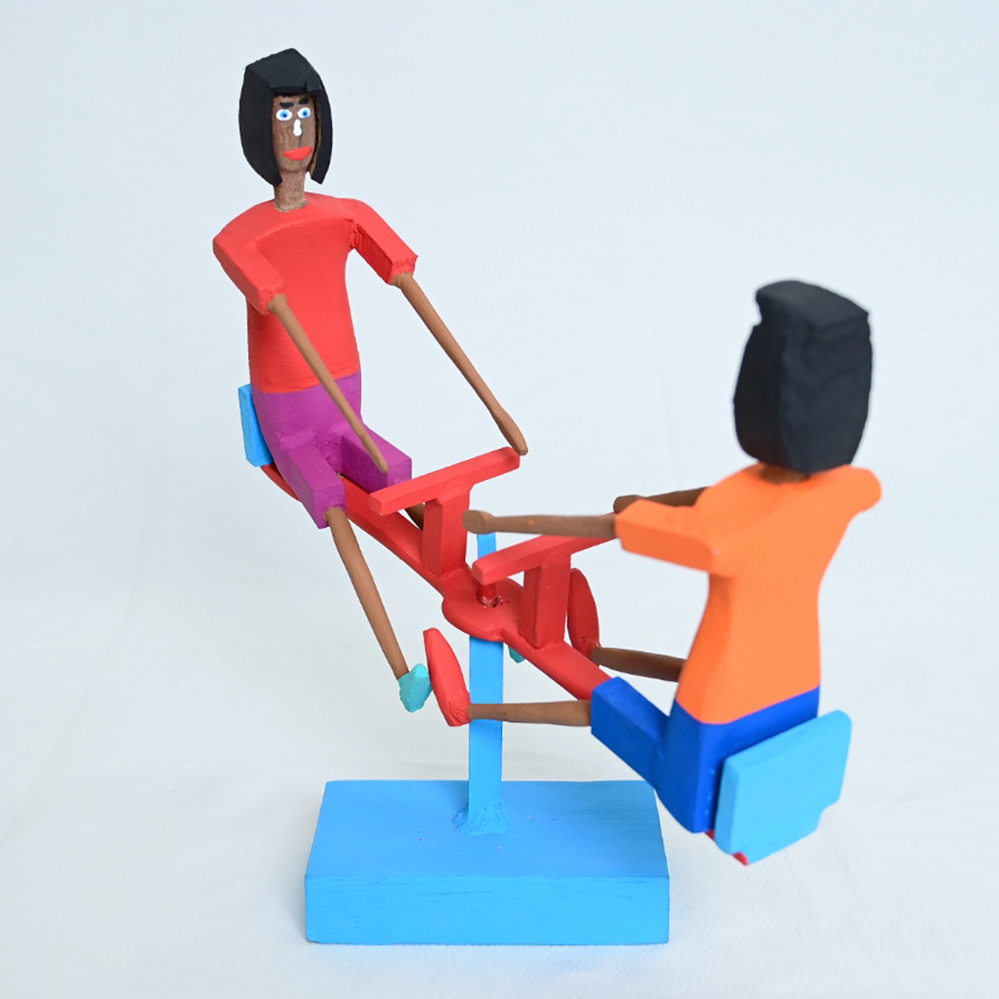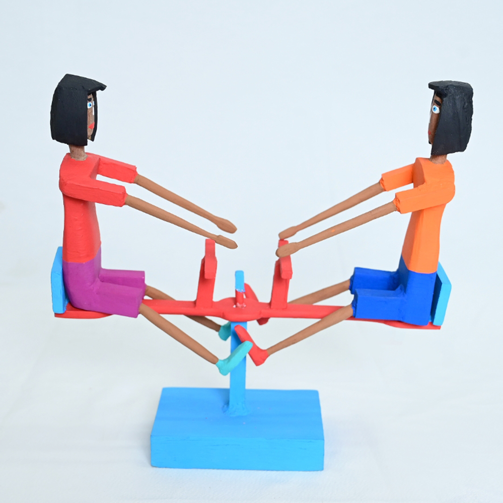 Escultura folclórica em madeira pintada que representa duas figuras em um balanço (gangorra) funcional. A peça de arte popular é colorida e montada sobre uma base azul, ideal para decoração temática.