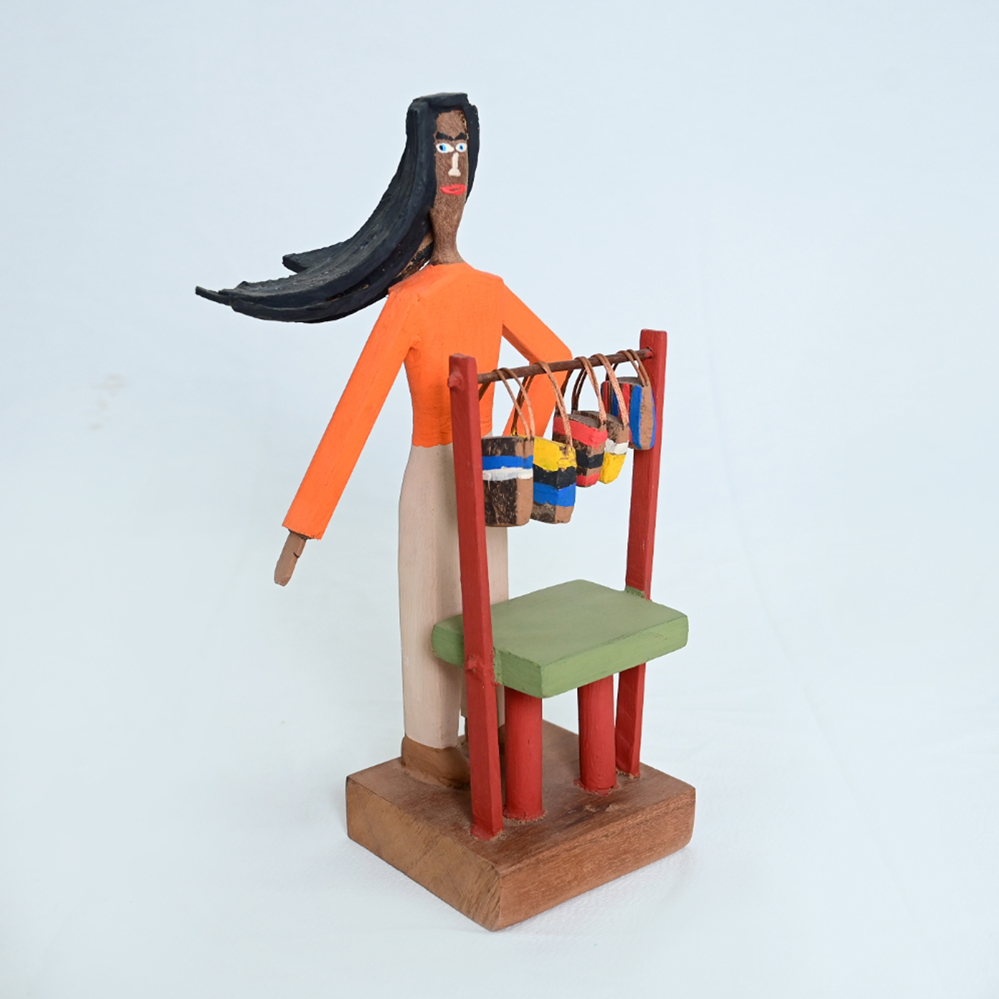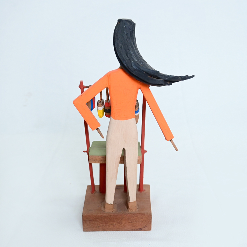 Escultura artesanal em madeira que representa uma vendedora de rua. A figura é pintada e tem um cabelo esvoaçante, apresentando seus pequenos baldes coloridos pendurados em uma estrutura de madeira.