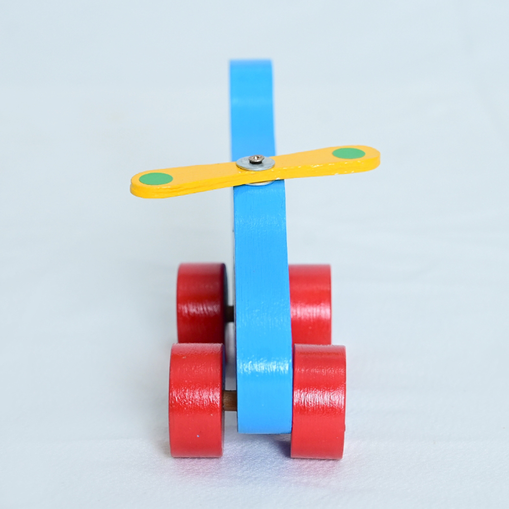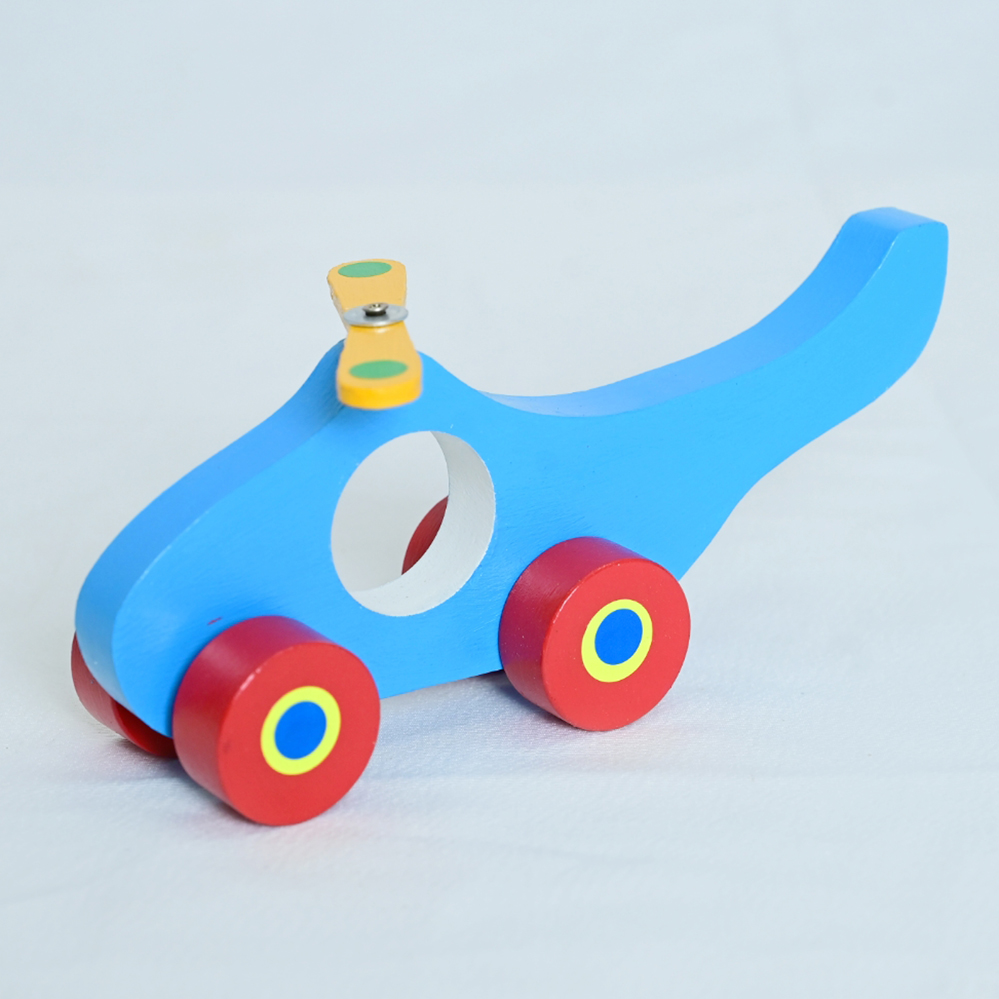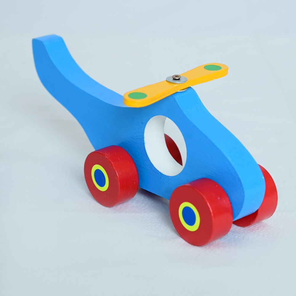 Helicóptero artesanal em madeira, com acabamento colorido, hélice móvel e rodas funcionais. Peça lúdica e decorativa, ideal para estimular a criatividade infantil.
