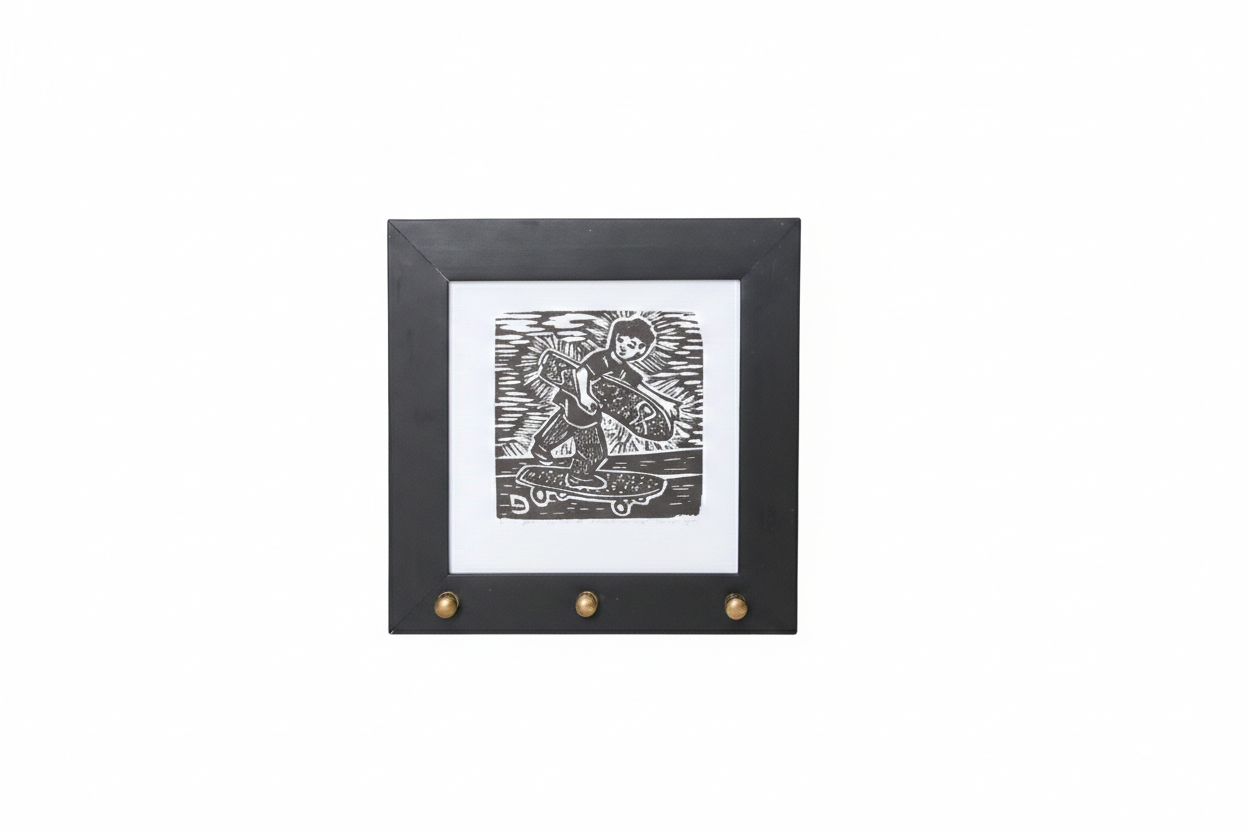 BRANCO/PRETO COM 3 GANCHOS E MOLDURA DE MADEIRA – DECORAÇÃO EM XILOGRAVURA