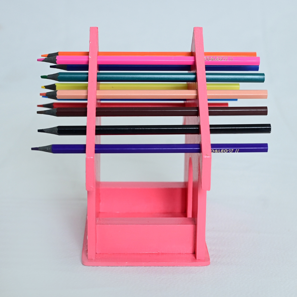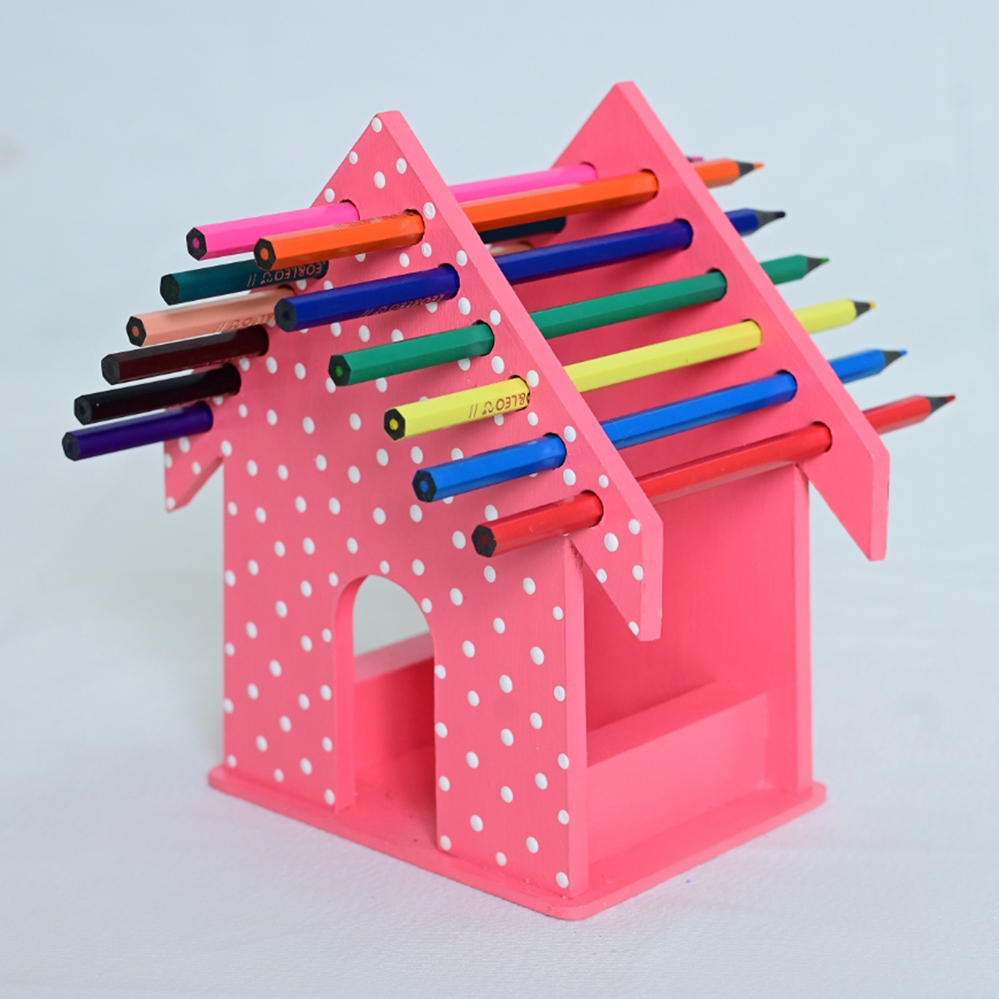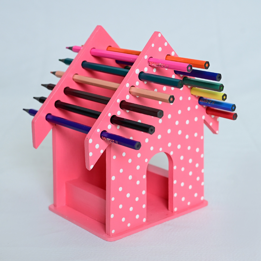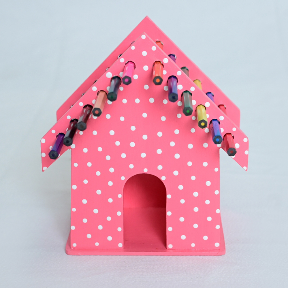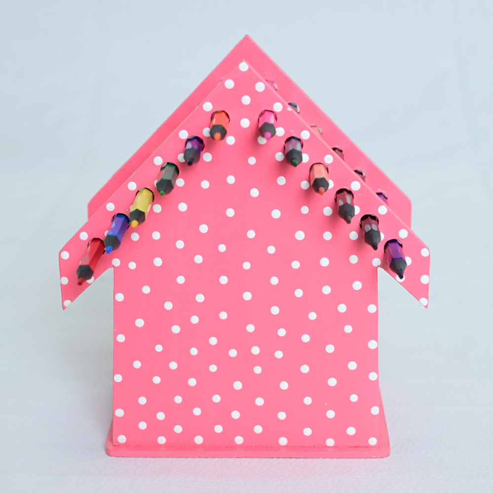 Porta-lápis artesanal em madeira, em formato de casinha, com pintura rosa poá. Funcional e decorativo, organiza lápis de forma prática e charmosa para escritórios ou ambientes infantis.